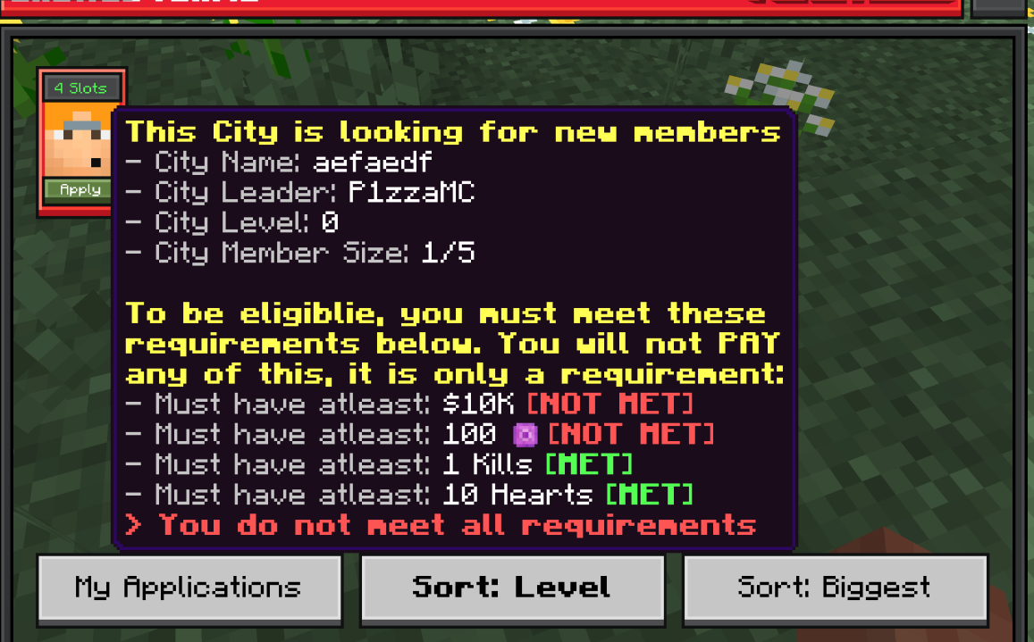 Teams/Cities can require incoming applicants to have a certain amount of money, orebits, kills, or hearts.
